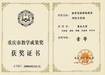 重庆市教学成果一等奖:“数学实验课程教学研究与实践”,重庆市人民政府颁发, 2001.12 ,刘琼荪,龚劬,傅鹂,任善强,何中市;
